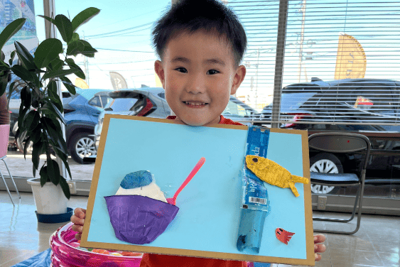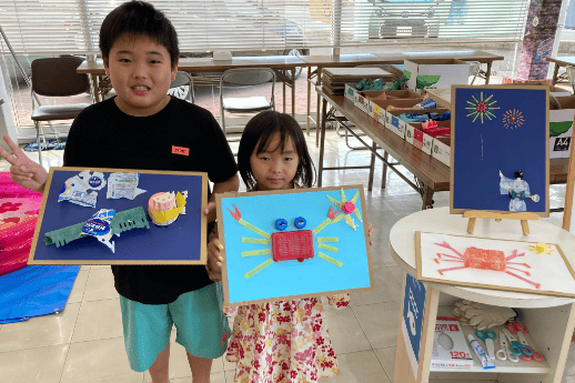 海ごみアートで素敵な作品を作る子供さんや、めだかすくいにチャレンジする方々。多くのお客様に楽しんでいただけました。